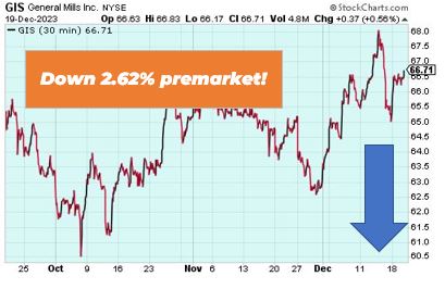 General Mills is down 2.62% premarket after shares fell due to a drop in sales for its recently ended quarter. Lower demand for snacks and breakfast foods contributed to the dip and GIS now expected slower recovery in sales volumes for the current fiscal year.