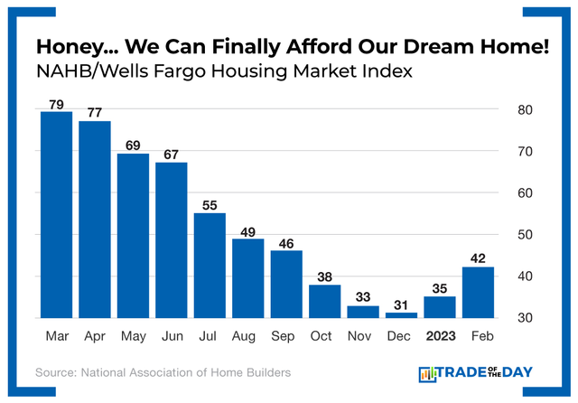 America’s homebuilders are growing more bullish as buyer demand picks up. The National Association of Home Builders/Wells Fargo Housing Market Index, which measures homebuilders’ confidence in the market for newly built single-family homes, rose seven points to 42 in February. It was the index’s biggest gain in a decade. Builders say affordability is improving as mortgage rates decline from their highs of last fall and settle into a narrow range. While the Federal Reserve is still looking to tighten monetary policy, this is a sign that the housing market could be on the rebound in mid-2023 and beyond.