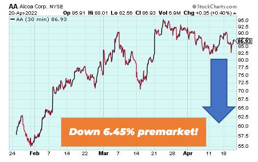 Alcoa Corp. is down 6.45% premarket as aluminum sales continue to drop due to lengthy supply chain disruptions. Aluminum prices are also down about 20% since hitting an all-time high at the beginning of March. Alcoa is looking volatile right now.