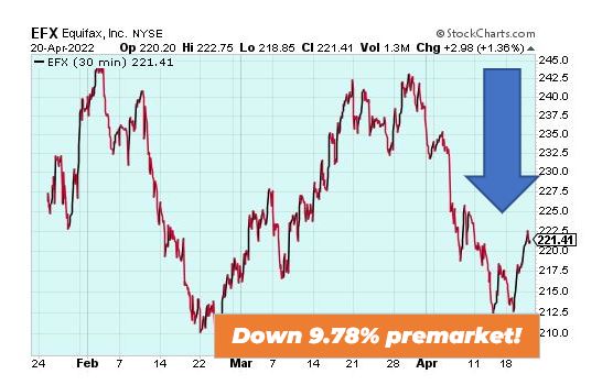 Equifax is down 9.78% premarket despite posting record first-quarter revenue of $1.36 billion. The company cut its full-year 2022 guidance principally to reflect mortgage rate increases, which now sit at a 10-year high. Equifax could be volatile going forward.