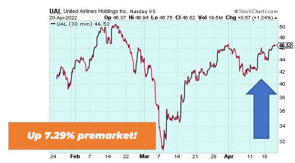 United Airlines is up 7.29% premarket despite the airline company missing earnings in the first quarter. Investors are optimistic about United Airlines in the near future, as more people start traveling again and COVID-19 mask mandates are lifted. American Airlines (Nasdaq: AAL) and JetBlue Airlines (Nasdaq: JBLU) were also up premarket. Keep an eye on the travel sector going forward.