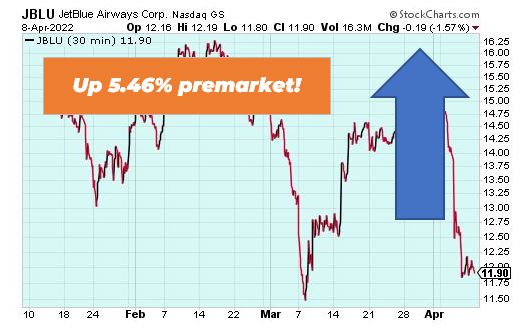 JetBlue Airways is up 5.46% premarket after the airline company announced it plans to ramp up hiring to meet the upcoming summer travel demand. JetBlue has already hired 3,000 new crew members in 2022 and expects to hire hundreds more per week leading up to the summer season. Keep an eye on JetBlue Airways going forward.