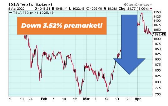 Tesla is down 3.52% premarket as the electric car company is seeing sluggish production in China due to strict COVID-19 laws. Tesla’s Shanghai plant has been closed for the past two weeks. Plus, sales in the world’s biggest car market tumbled 11.7% in March from a year earlier to 2.23 million vehicles – its first decline in three months. This contrasts sharply with an 18.7% bump in February, according to the China Association of Automobile Manufacturers. Tesla is a stock to be cautious of going forward.