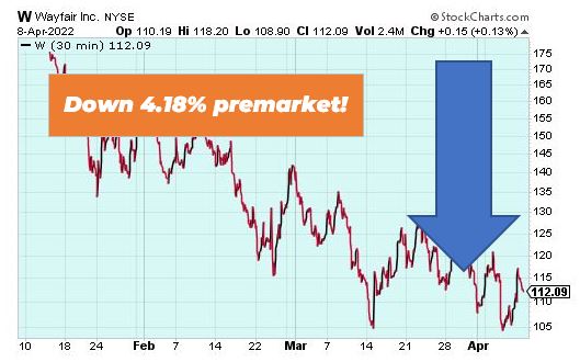 Wayfair is down 4.18% premarket as the furniture company is seeing a halt in the home renovation boom. The pandemic caused a lot of people to stay at home and work on their house, but inflation and more people now getting out could lead to a drop in sales revenue. Wayfair is a stock that could be volatile going forward.