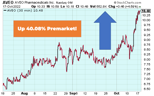 AVEO Pharmaceuticals is up 40.08% premarket. Shares of the oncology-focused biopharmaceutical company jumped this morning after it was announced that they have been acquired by Korean chemical company, LG Chem, for $15 a share. With a closing price of $10.48 yesterday that buyout pricing is a 50% increase over the current price. The combined company has the potential to dominate the global oncology market with a full suite of innovative products to support patients, from discovery to clinical treatment.
