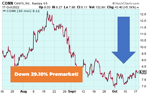 Conn’s Inc. is down 29.10% premarket. The company also known as Conn’s Home Plus is a furniture and home appliances retailer with 160 retail locations in the southern US. This morning it was announced that President and Chief Executive Officer Chandra Holt has stepped down, former President Norman Miller will take over as Interim President. Conn’s and other major retailers are struggling with high inflation and gas prices. The Company currently expects total revenue for the next quarter to be down more than 20%.
