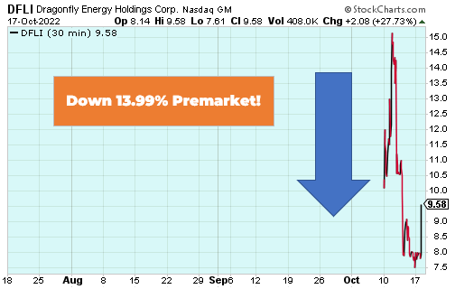 Dragonfly Energy Holdings is down 13.99% premarket. The company, which produces lithium-ion batteries for RVs, boats and off-grid installations, was private until recently. On October 10th they merged with special purpose acquisition company Chardan NexTech Acquisition 2 Corp and began trading on the Nasdaq with the symbol DFLI. Initial trading sent shares soaring 100% from $10 to up over $20 in a day! Now two weeks later the dust is settling, and shares have fallen below the $10 mark.