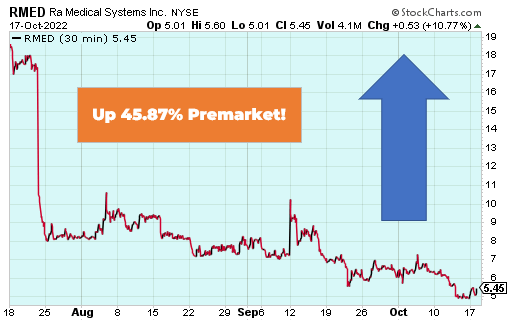 Ra Medical Systems is up 45.87% premarket. The medical device company has completed its at-the-market sale of 1,072,246 shares of common stock at an average price of $7.09 per share, raising gross proceeds of $7.6 million. The funds raised by the effort will go towards a proposed merger with Catheter Precision, another US-based medical device company focused on innovations in the treatment of cardiac arrhythmias. The merger should be completed by the end of the year.