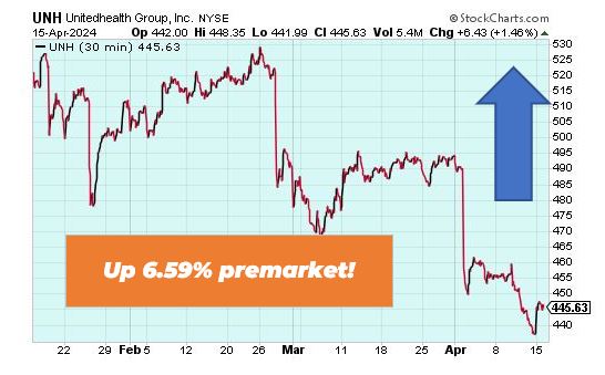 UnitedHealth is up 6.59% in premarket after reporting strong first quarter earnings. Earnings per share of $6.91 per share beat analysts’ estimates of $6.61. Revenue came in at $99.8 billion, which beat forecasts of $99.2 billion.