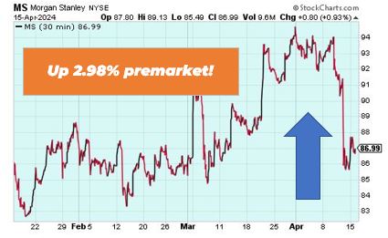 Morgan Stanley is up 2.98% in premarket trading after reporting profits for the first quarter. The Wall Street bank finished strong asset growth, posting $7 trillion of client assets across wealth and investment management. It also reported net income of $3.4 billion in the three months ended March 31 compared to $3 billion at the same time last year.