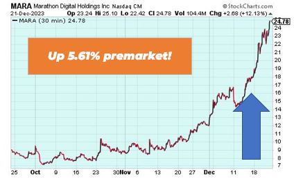 Marathon Digital is up 5.61% premarket after the bitcoin ecosystem provider added Anchorage Digital Bank National Association as a bitcoin custodian. The addition increases the number of marathon’s bitcoin custodians from two to three.