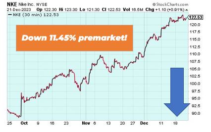 Nike is down 11.45% in premarket trading after posting mixed second quarter results. Adjusted earnings per share of $1.03 topped Wall Street expectations of $0.85, but revenue of $13.39 billion was just shy of estimates $13.46 billion. The athletic apparel company also announced its plans to cut $2 billion worth of costs over the next three years, citing weakness in its online business as the reason.
