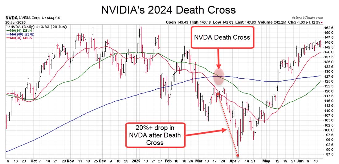 The last time Nvidia formed a death cross was in March 2024. After that signal, the stock declined approximately 21% before finding a bottom in April.
