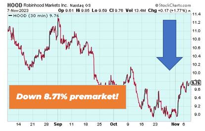 Robinhood is down 8.71% premarket after the digital trading platform reported a third-quarter loss. It came out with a loss of $0.09 per share versus the Zacks Consensus Estimate of a loss of $0.10. This compares to a loss of $0.20 per a share a year ago.