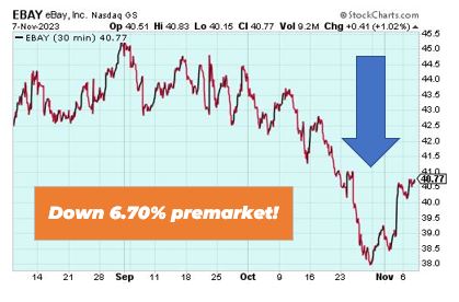 eBay is down 6.70% premarket after the company updated its forecast for the end of the year. Citing “softening demand,” eBay now expects sales of $2.47 billion to $2.53 billion for the fourth quarter. Analysts expected $2.6 billion. The e-commerce company also reported adjusted earnings of $1.03 per share on $2.5 billion in third-quarter sales.