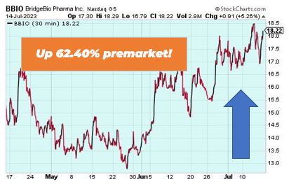 BridgeBio is up 62.40% after announcing positive results from a Phase 3 ATTRibute-CM study of acoramidis for patients with transthyretin amyloid cardiomyopathy. A key objective in the drug’s design was to maximize TTR stabilization at clinically achieved blood concentrations.