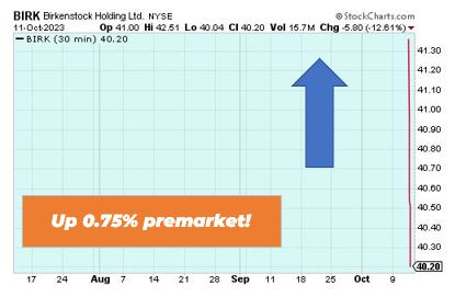Birkenstock is up 0.75% premarket. The company saw its shares fall in its debut on the New York Stock Exchange. The stock closed down nearly 13% during after hours trading. Former LVMH Chairman of North America called the company’s valuation “greedy.”