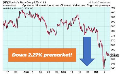 Dominoes Pizza is down 2.27% in premarket trading after posting earnings for the third quarter. The pizza company saw a 0.6% decline in sales across its U.S. stores. It also saw a third quarter global net store decline of 8 stores.
