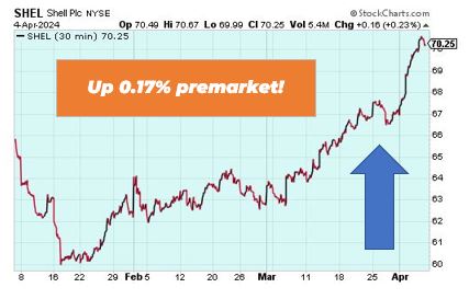 Shell is up 0.17% premarket as prices rise due to ongoing tensions in the Middle East. The company also released its latest production forecasts and they’re expected to range between 960 to 1,000 barrels of oil equivalent per day.