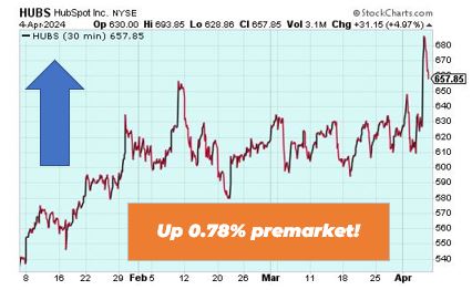 Hubspot is up 0.78% in premarket. The stock surged in after-hours trading yesterday after rumors Google is interested in acquiring the company. Hubspot’s shares are very volatile with 10 moves greater than 5% over the last year.