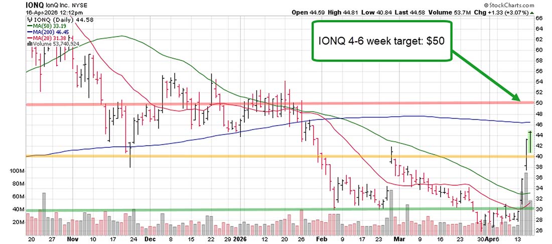 My 4-6 week target on IONQ is a move to $50. That’s 12% higher than today’s price.