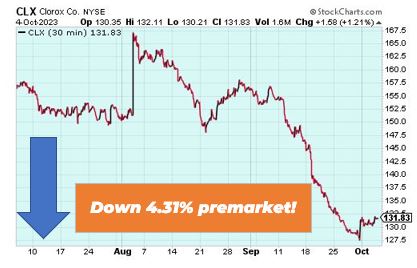 The Clorox Company is down 4.31% premarket after the company warned its quarterly sales will drop at least 23% and it will post a deep loss after a cyberattack hurt its business. Other metrics – gross margin, organic sales and diluted net earnings per share – will see negative effects as well, according to the company.