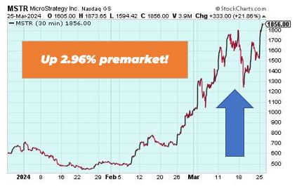 Microstrategy is up 2.96% premarket after the latest crypto rally. Bitcoin moved above $70,000 on Monday and bitcoin-related stocks like Microstrategy saw a move higher. Other crypto-related stocks such as Coinbase (COIN) were also up 1.94% in premarket trading.