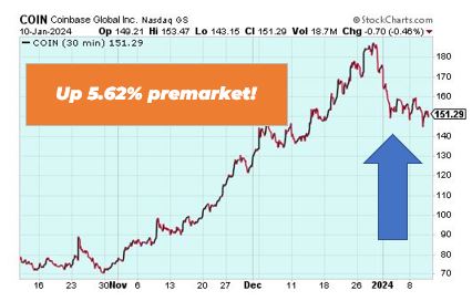 Coinbase Global Inc.’s (COIN) stock is up 5.62% in premarket trading due to the U.S. Securities and Exchange Commission’s (SEC) approval of eleven spot bitcoin ETFs. Coinbase will serve as the custodian for a majority of the issuers that were approved. This development is significant for Coinbase and the cryptocurrency market, as it represents a landmark step in gaining mainstream acceptance and potentially inviting more institutional investment into the crypto space.