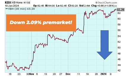 KB Home is down 2.09% in premarket trading after posting lower sales and earnings for its fiscal fourth quarter. However, the homebuilder said it is seeing signs of improving demand as the Federal Reserve signals that it won’t raise interest rates further. Overall, revenue fell 14% to $1.67 billion, but topped analysts’ expectations of $1.63 billion.