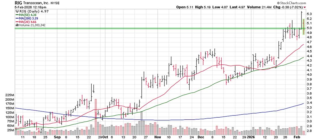 Last week, I identified RIG as a breakout candidate heading toward a break above the psychologically significant $5 price. Historically, a break of this price signals preparation for a run to $7.50.