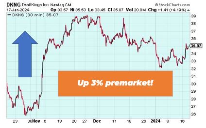 DraftKings is DraftKings Inc. (NASDAQ: DKNG) is up 3% in premarket trading due to several factors. For one, it received positive analyst sentiment with an average brokerage recommendation leaning strongly towards a buy. It’s also seeing increased confidence from institutional investors, notably a 7.7% stake increase by the Bank of New York Mellon Corp. Lastly, the sports betting giant announced a partnership with TUMS® and comedian Desus Nice for the TUMS® Prop Bites.