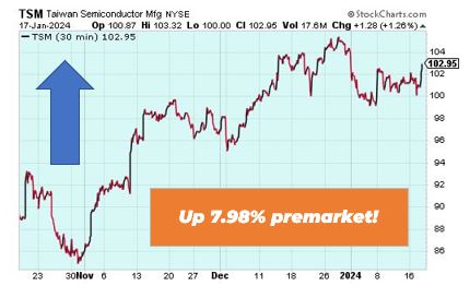 Taiwan Semiconductor is up 7.98% in premarket trading after the chipmaker gave a bullish forecast. The chip foundry giant predicted more than 20% revenue growth in 2024, fueled by demand for artificial intelligence chips.