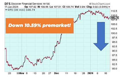 Discovery Financial Services is down 10.59% premarket after reporting a significant decrease in fourth-quarter profit, primarily due to increased provisions for bad loans. The company’s profit for the quarter fell 62%, with net income dropping to $388 million, or $1.54 per share, compared to $1.03 billion, or $3.74 per share, a year earlier. This decline was largely attributed to a higher provision for credit losses, which increased to $1.91 billion from $883 million the previous year.