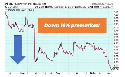 Plug Power is down 16% in premarket trading. This drop came after the company filed for a potential $1 billion share offering. Investors are concerned about the dilution of shares and the potential impact on the company’s value. Over the last two years, Plug Power’s stock has declined over 88%, indicating ongoing challenges and investor skepticism about the company’s financial strategies and market position.