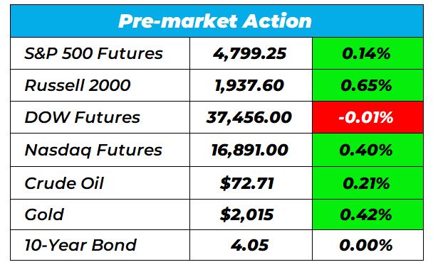 Good Morning Wake-Up Watchlisters! While you’re sipping coffee you’ll see stock futures gained on Thursday. Traders are coming to grips with the idea that interest rate cuts could be delayed beyond the first quarter. Now the focus shifts to earnings as several tech companies report today (more on those below.)