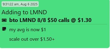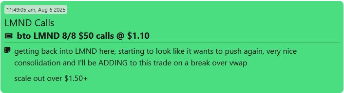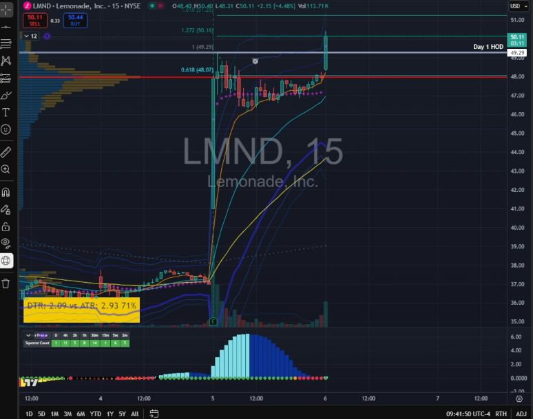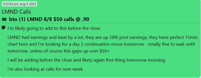 In the case of LMND, after it reported earnings I noticed on my S.A.M. Scanner that it had a perfect 15-minute chart. So I added some calls before the end of the day to potentially capture early Day 2 momentum.