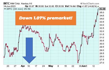 Intel is down 1.07% premarket after a recent pullback. However, Intel has been gaining momentum, with a 9.5% increase this week and a 19% overall spike in a single quarter. The company has been hitting some promising benchmarks. For one, AI company Nvidia chose Intel’s CPU for their platform, and reports are showing that Intel’s CPU has 7x performance over fellow competitor AMD’s Genoa Server CPU.