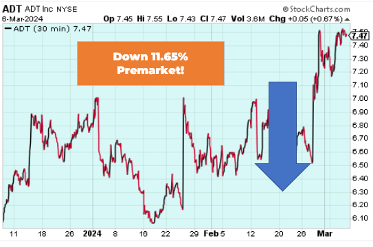 ADT Inc. is down 11.65% in the premarket after posting lower than expected revenue in their Q4 earnings report released yesterday. Leadership is pointing to the dragging residential solar business which the company exited in January as the main culprit for the poor number. At the same time they also increased the dividend and announced a $350 million stock buyback plan so its not all bad news for shareholders.