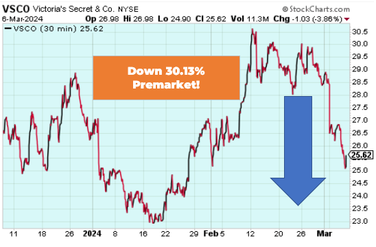 Victoria’s Secret & Co. shares are are down 30.13% in the premarket after the lingerie posted a dissapointing sales forecast yesterday evening. Despite increases in net income and revenue year-over-year Victoria’s Secret will join following disappointing results from Nordstrom yesterday it appears that a steady decline in North American apparel purchases is set to continue.