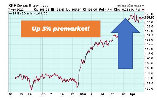 Sempra is up 3% premarket after the Federal Regulatory Commission (FERC) agreed Thursday to grant Sempra Energy an extension to build two pipelines in Texas and Louisiana to connect to a Texas natural gas plant. The extension runs through March 31, 2023. As globalization shifts and the U.S. could start relying more on its own energy sources, Sempra is a stock to watch going forward.