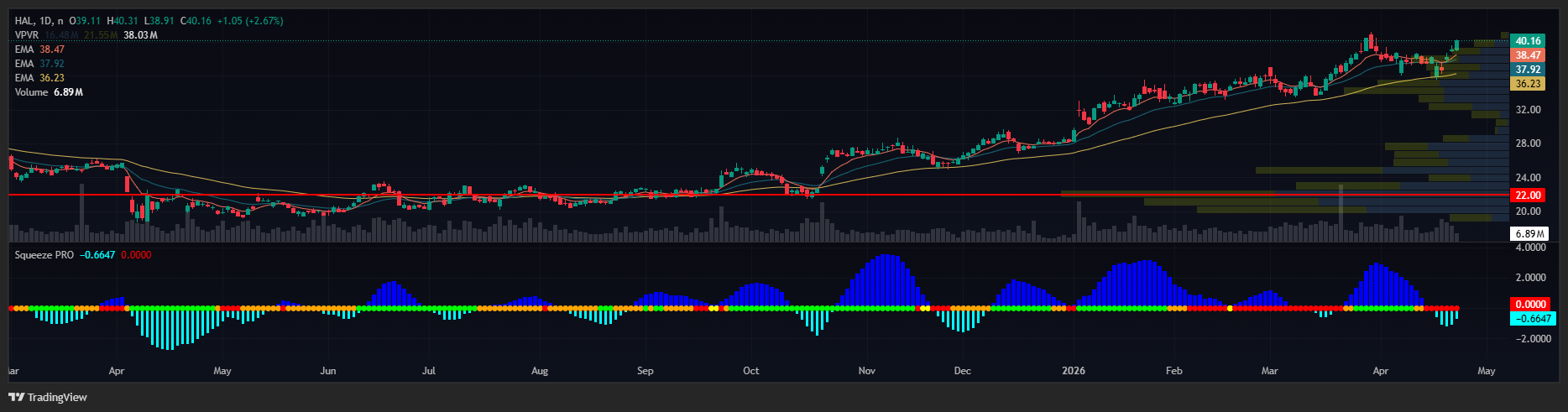 The trend check starts with the moving averages. An exponential moving average, or EMA, weights recent prices more heavily than older data. On Halliburton’s daily chart price is sitting above the 8-day EMA. The 8-day is above the 20-day EMA.