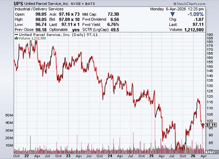 At $97.22, UPS trades at 13.4x forward earnings, a valuation it has not seen in over a decade. It has raised its quarterly dividend for 16 consecutive years. At this price, the yield is nearly 7%. You are getting paid to own it while you wait for the recovery.