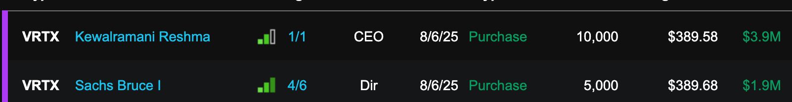 As you can see, the CEO of VRTX bought over 10,000 shares worth $3.9 million, and the director bought 5,000 shares worth $1.9 million.