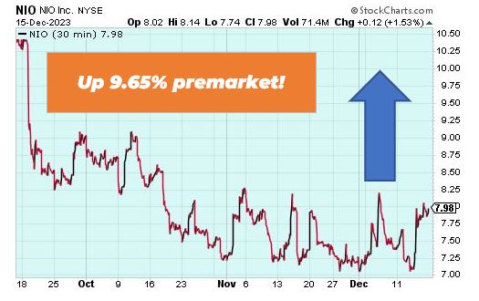 NIO is up 9.65% premarket after the electric vehicle maker announced it signed a pact for an investment of $2.2 billion from CYVN Holdings, an investment vehicle based in Abu Dhabi, the Chinese company said on Monday. The deal is expected to close in the final week of December, would take CYVN’s shareholding to 20.1% of Nio’s total issued and outstanding shares, following an investment of $1 billion in July.