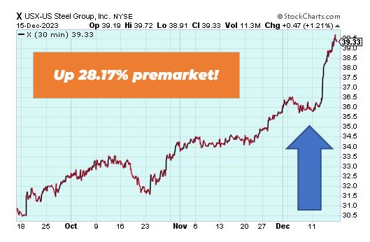 United States Steel Corporation is up 28.17% premarket in response to a $14.9 billion acquisition by Nippon Steel. Japan’s largest steelmaker will buy the American company for $55 a share in cash, a 40% premium to the stock’s closing price Friday.